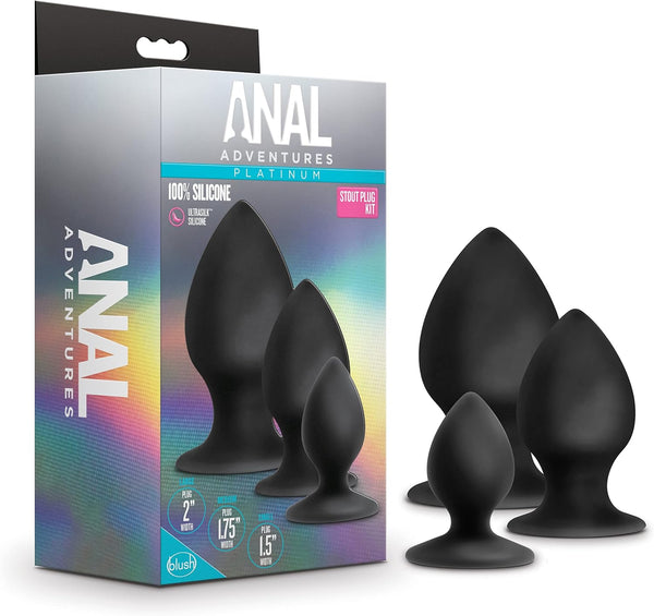 For anyone looking to explore new anal sensations alone or with a partner! Anal Adventures provides many options to choose from. This kit has 3 tapered girthy plug sizes to move up from small to large and achieve a comfortable stretch! The Ultrasilk Silicone with it's silky-smooth feel warms with your body heat. EXPLORE - Perfect for Adding New Sensation SIZE UP - 3 Sizes for Safe Anal Stretching EASY - Tapered Shape and Smooth Easy-to-Clean Silicone PEACE OF MIND - Made from UltraSilk Silicone and Body Safe ABS Plastic. Contains No Phthalates Paraffins or Latex SIZE - Mini: 2.5 Inch Length x 1.4 Inch Width x 2 Inch Insertable / Small: 3 Inch Length x 1.6 Inch Width x 2.5 Inch Insertable / Medium: 4 Inch Length x 2 Inch Width x 3.25 Inch Insertable COLOR - Black/li>