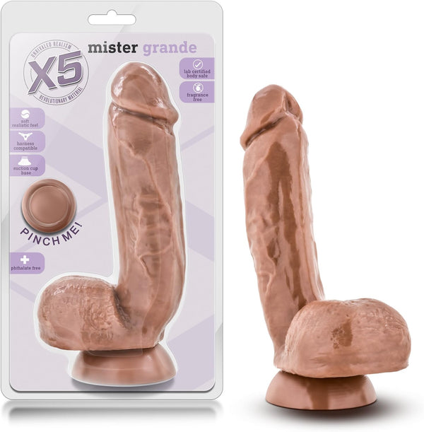 This X5 Mister Grande Realistic Dildo by Blush Novelties looks and feels like the real thing. It is made to please and satisfy even the most discriminating of dildo connoisseurs. The suction cup makes it harness compatible and is built for the cowboy or cowgirl in you, while the fleshy balls provide a cushion for a wild ride. Giddy Up! You can also suction this to any flat surface, headboard/footboard, shower door/wall, or even explore with a sturdy mirror! Mister Grande is Phthalate and Latexfree, itâs made out of X5 a unique material with superior properties that feels real and even warms to the touch. It is safe for all skin types even the most sensitive ones. The flexible shaft, firm yet pliant makes this an excellent sex toy for vagina, private part exploration in women or prostate massage in men and is thick enough to satisfy the most demanding lover. Meet Mister Grande today! Our products are 3rd party tested for product safety. Our materials comply with international safety requirements. Verify Your Product Is Genuine By Scratching Label For Code That Can be Verified On Our Website. If Product Is Not Genuine Contact Seller And Demand A Refund And Report This Crime To Us Immediately. It's Your Body, Be Mindful Of What You Put In It