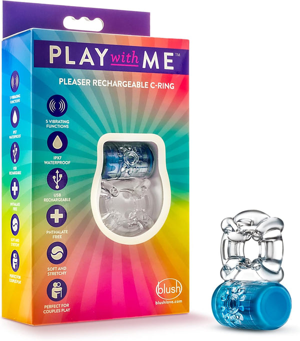 Amplify your pleasure and extend your playtime! C-Rings are known to give you a longer and harder shaft. Play With Me Rechargeable Vibrating C-Rings can be worn around the base of the shaft or underneath the balls and are stretchy and soft, sized to comfortably fit all. The Play With Me Pleaser vibrates to stimulate both you and your partner. Choose from 5 different vibration patterns, 1 speed, and 4 thoughtfully designed vibration patterns. Rechargeable, cable included. Position the vibrating bullet between you and your partner during partner play or directly on any pleasure point on your own body during solo play! Responsibly Made By Blush. We Care About Your Health And Wellness And Are Mindful Of What We Provide For Your Body. Lab Tested & Certified In Compliance With Prop65 & REACH Product & Material Safety Requirements. We Recommend Cleaning With Soap And Water Before And After Use. Silicone, Water Based, Hybrid Lube Safe