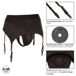 Get that sexy look with the California Exotics Boundless Thong with Garter Strap On. The Boundless™ Thong with Garter is an ultra-comfortable harness fashioned like a risqué backless brief with powerful performance and comfort in mind. This bold harness has an extra-wide waistband, unique garter belt design and reinforced O ring for the ultimate support. The thong design is comfortable, with a stretchy O-ring in the front to accommodate your favorite packer, vibrator or dildo. The sensual garter belt is complete with adjustable straps for a sexy, yet comfortable fit. Enjoy pleasure made for two with the double panel interior for easy access to your favorite probe. It's perfect for packing, pegging, or playing with a vibrator. You can wear it for hours, then enjoy an easy cleanup. So slip it on and explore!
